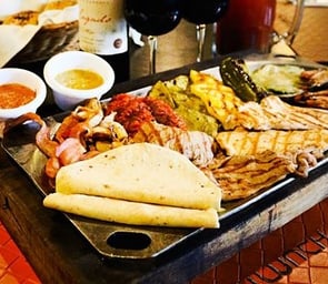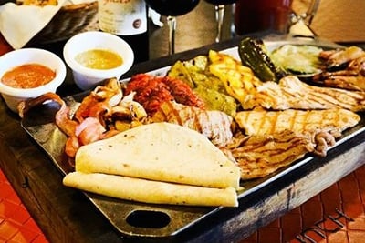 Parrillada arrachera, de costilla o mixta. Todas con quesadillas, chiles toreados, piña asada, pimientos gratinados, nopales y chorizo.