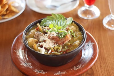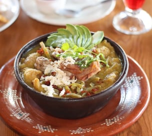 Servido en una cazuela con nopales, chorizo y manitas de cerdo.
